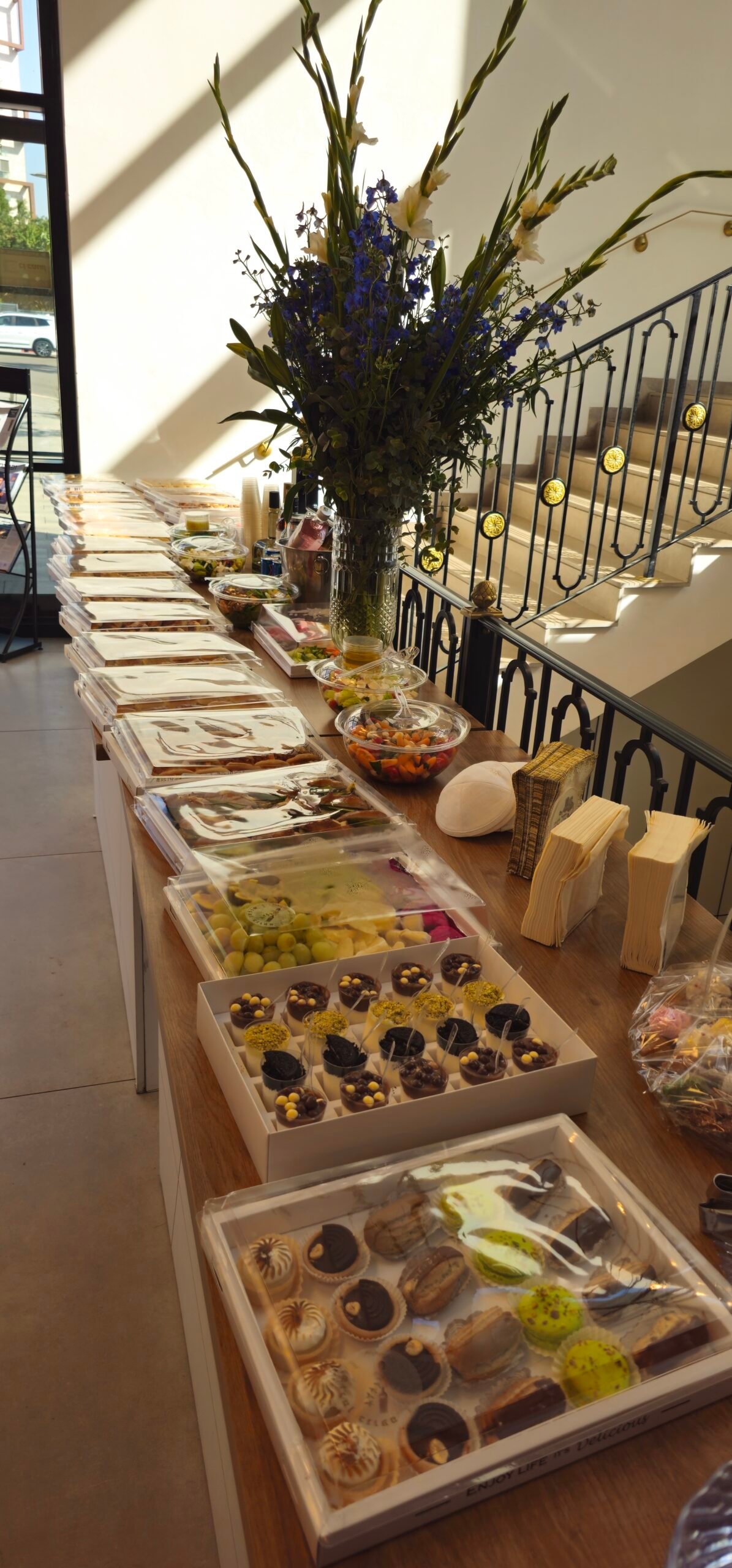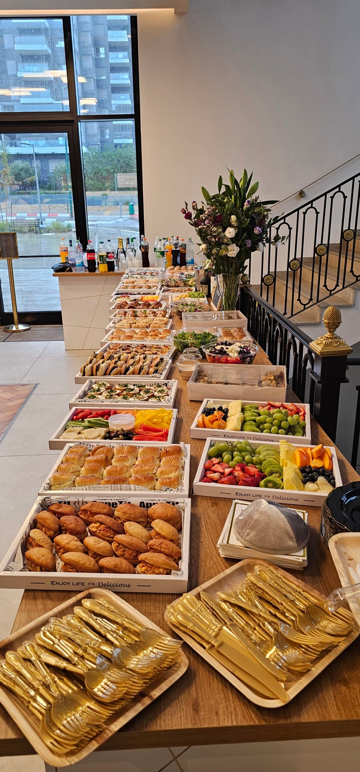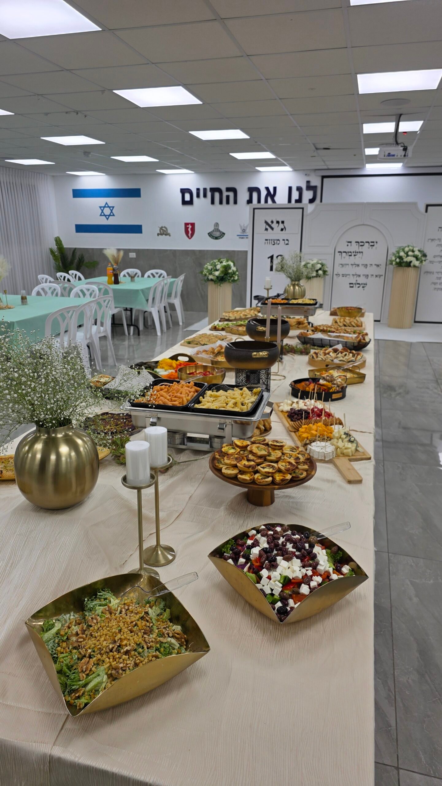 פתרון כיבוד מושלם לאירועים לאחר תפילה, עלייה לתורה ובר מצווה, עם מגשים מסודרים ומוכנים להגשה המתאימים לאווירת בית הכנסת.